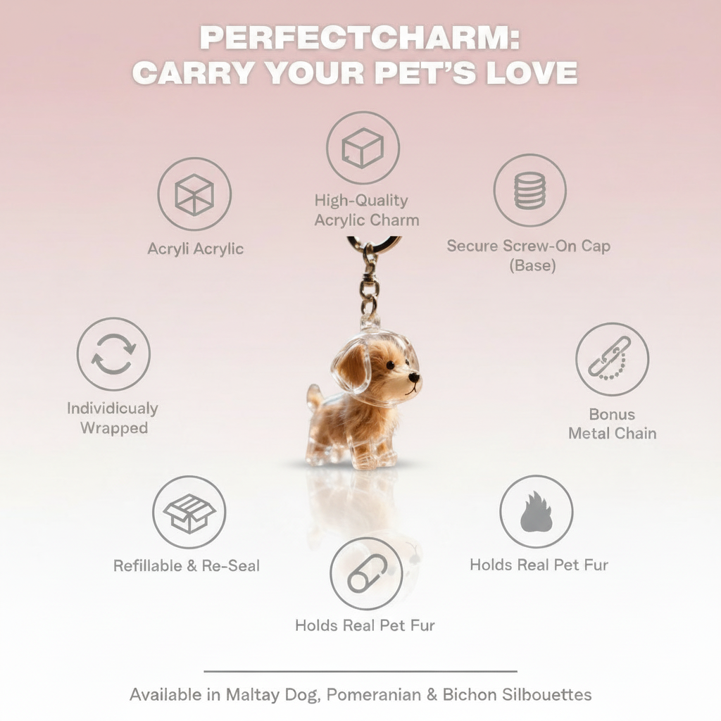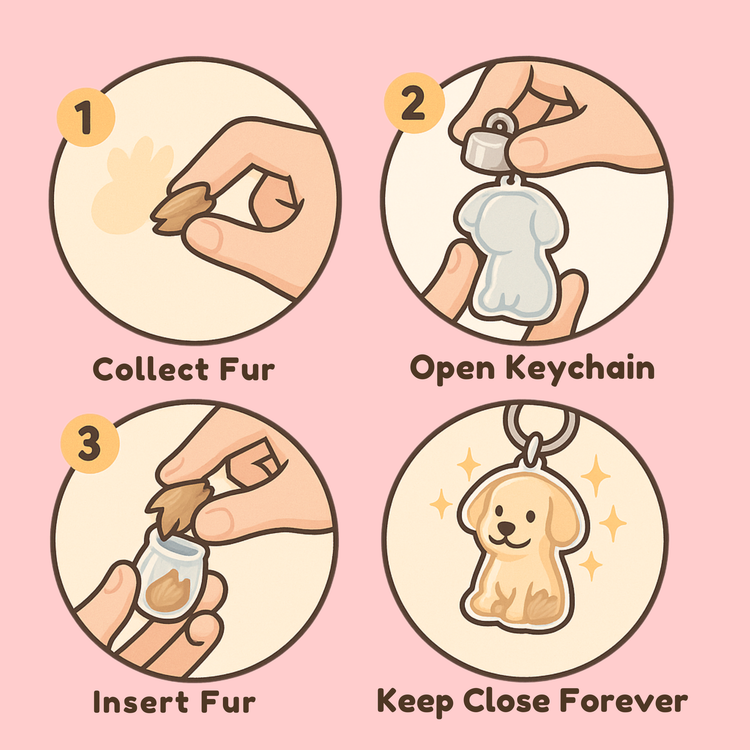 Collect a tiny pinch of your pet’s fur, gently open your Perfect Charm and place the fur inside, then close it securely and clip it to your keys or bag to keep them close forever.